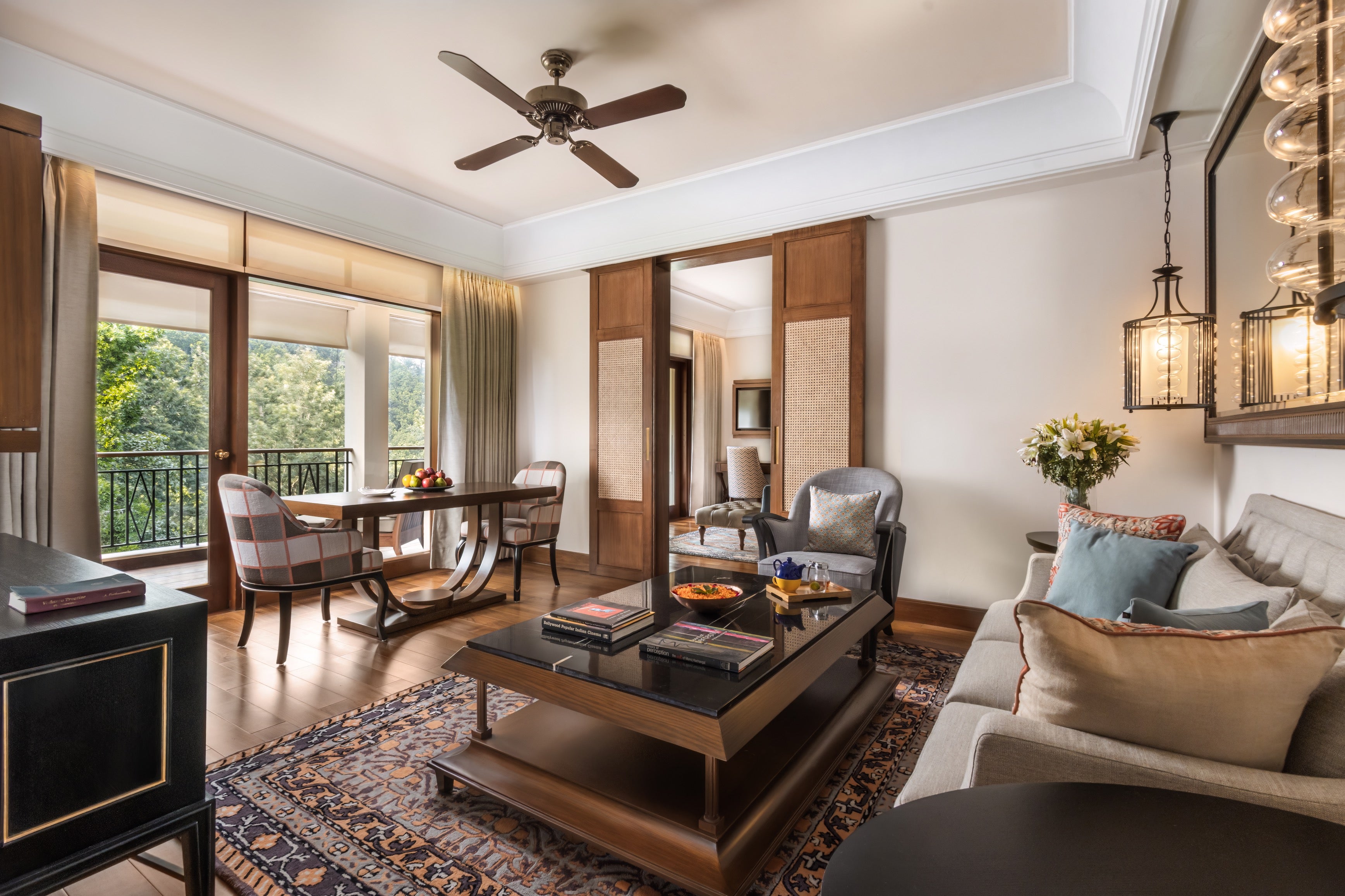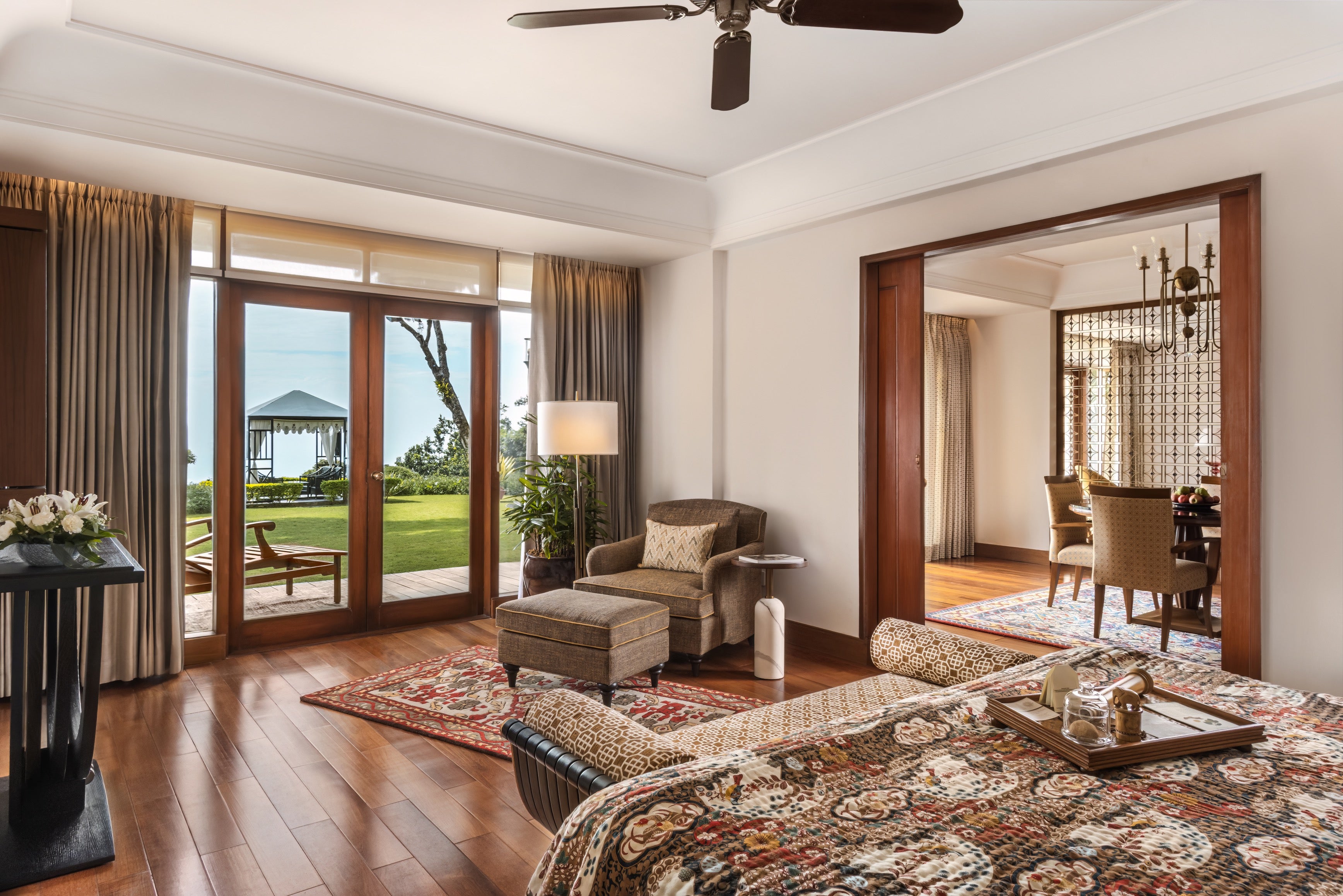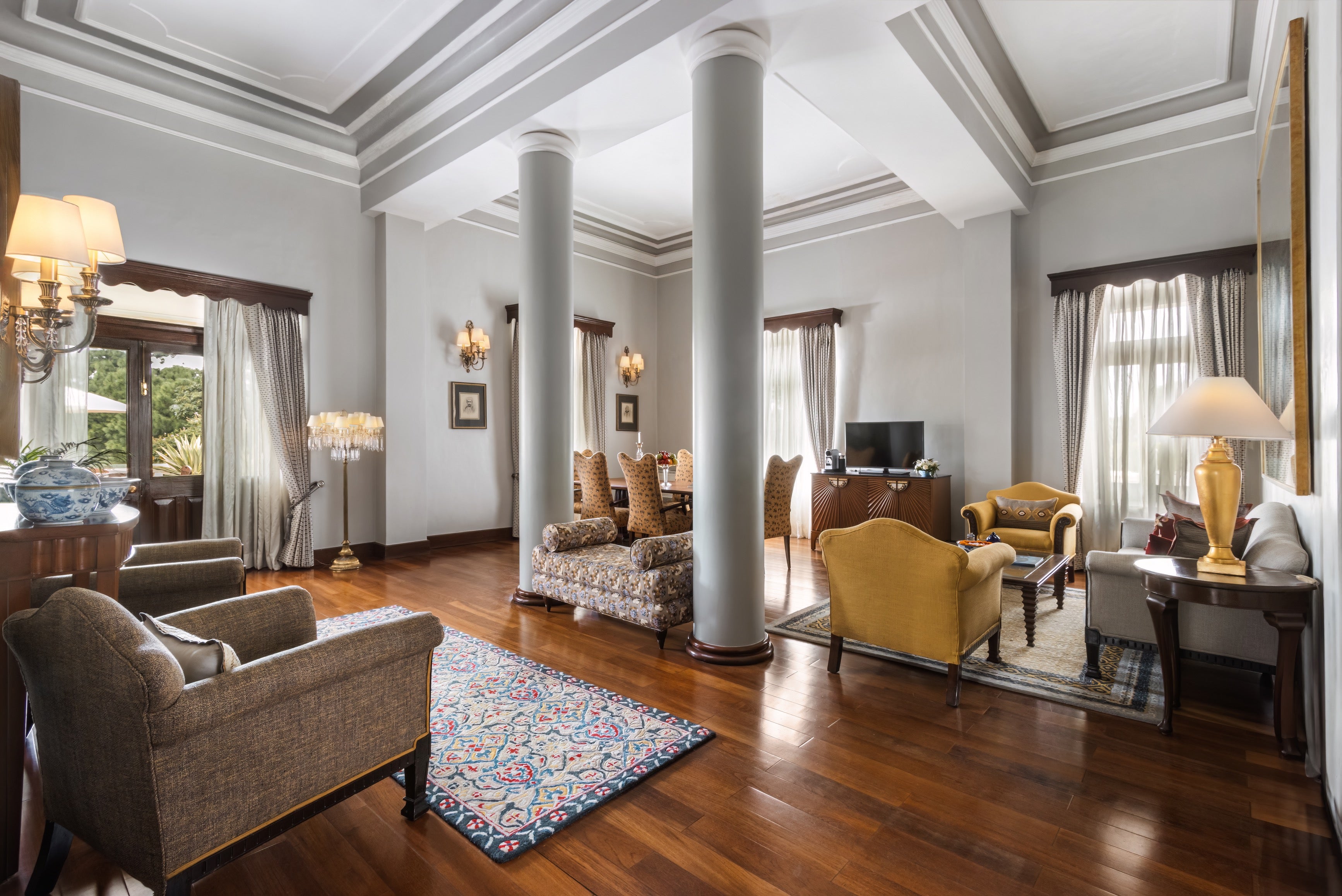 Hotel style: Restored Maharaja's palace estate featuring traditional Indian architecture with modern amenities, surrounded by lush gardens and forests.